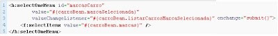 Bom, o primeiro entrave encontrado foi em relação à submissão do formulário: ela não é realizada na alteração da selectOneMenu sem que coloquemos o “onchange=’submit()’” explicitamente!