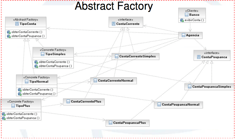 Temos então 3 tipos de fábrica de contas poupança ou corrente de acordo com o tipo necessário, são elas: TipoSimples, TipoNormal e TipoPlus. Todas essas fábricas concretas são representadas pela Fábrica Abstrata TipoConta, que é quem define os métodos de criação, ou seja, qualquer que seja a nova fábrica a ser criada para contas, ela deve ser capaz de criar os novos tipos de conta de acordo com o proposto por essa abstração. Assim definimos o processo de criaçõ totalmente flexível: não precisamos mudar nenhum código existente para criarmos mais um tipo de conta!